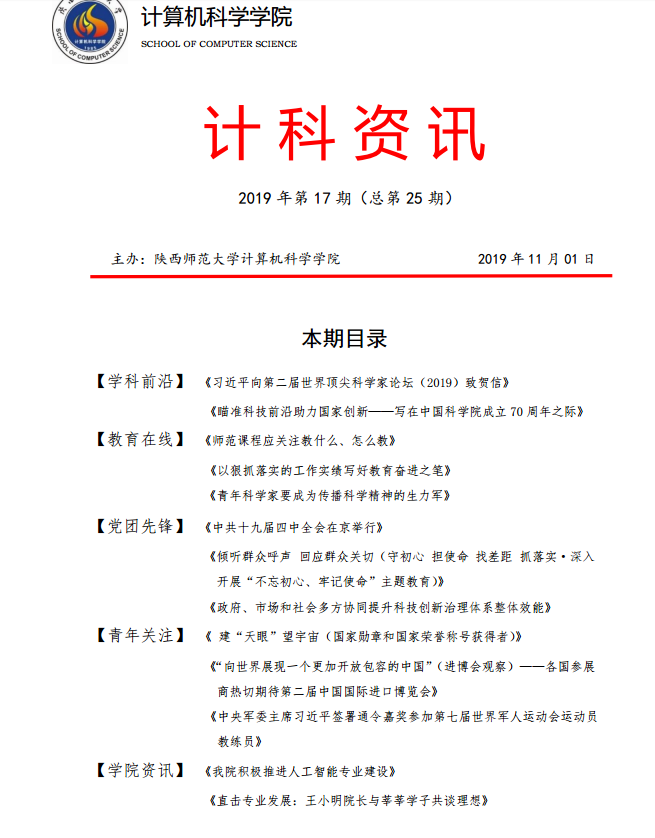 《计科资讯》是龙8在线登录官网-龙8(中国)编辑整理的电子资讯,信息来源为《光明日报》《人民日报》《中国青年报》等权威纸媒,编辑工作由学院优秀本科生党员、团员承担。《计科资讯》主要包括学科前沿、教育在线、党团先锋、青年关注及学院资讯五个版块。学院师生可以从中了解到专业前沿和国家时政大事,欢迎大家下载阅读。