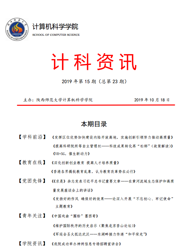 《计科资讯》是龙8在线登录官网-龙8(中国)编辑整理的电子资讯,信息来源为《光明日报》《人民日报》《中国青年报》等权威纸媒,编辑工作由学院优秀本科生党员、团员承担。《计科资讯》主要包括学科前沿、教育在线、党团先锋、青年关注及学院资讯五个版块。学院师生可以从中了解到专业前沿和国家时政大事,欢迎大家下载阅读。