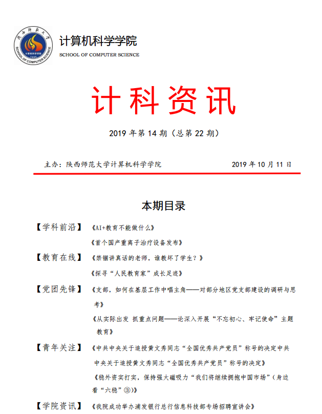 《计科资讯》是龙8在线登录官网-龙8(中国)编辑整理的电子资讯,信息来源为《光明日报》《人民日报》《中国青年报》等权威纸媒,编辑工作由学院优秀本科生党员、团员承担。《计科资讯》主要包括学科前沿、教育在线、党团先锋、青年关注及学院资讯五个版块。学院师生可以从中了解到专业前沿和国家时政大事,欢迎大家下载阅读。
