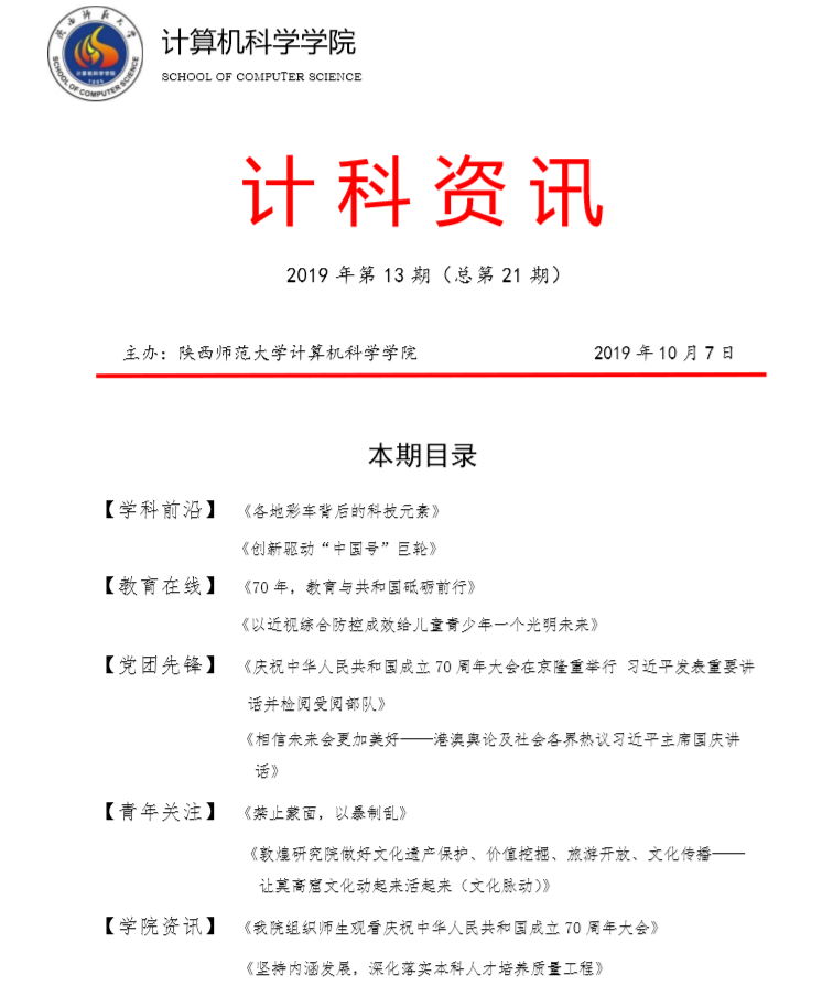 《计科资讯》是龙8在线登录官网-龙8(中国)编辑整理的电子资讯,信息来源为《光明日报》《人民日报》《中国青年报》等权威纸媒,编辑工作由学院优秀本科生党员、团员承担。《计科资讯》主要包括学科前沿、教育在线、党团先锋、青年关注及学院资讯五个版块。学院师生可以从中了解到专业前沿和国家时政大事,欢迎大家下载阅读。