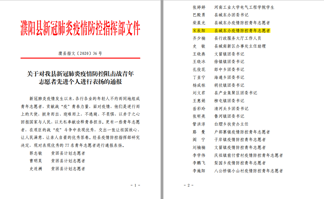3月14日,学院收到了来自河南省濮阳县新冠肺炎防控指挥部文件,对疫情防控工作中的优秀青年志愿者进行了表扬。龙8在线登录官网-龙8(中国)2018级软件工程专业硕士研究生宋辰阳名列其中。目前,学院统计到的奋斗在家乡防疫一线的龙8在线登录官网-龙8(中国)青年党员志愿者还有18位。他们承担着最基础的工作,履行着最普通的使命,用自己的行动守护着一份安宁。