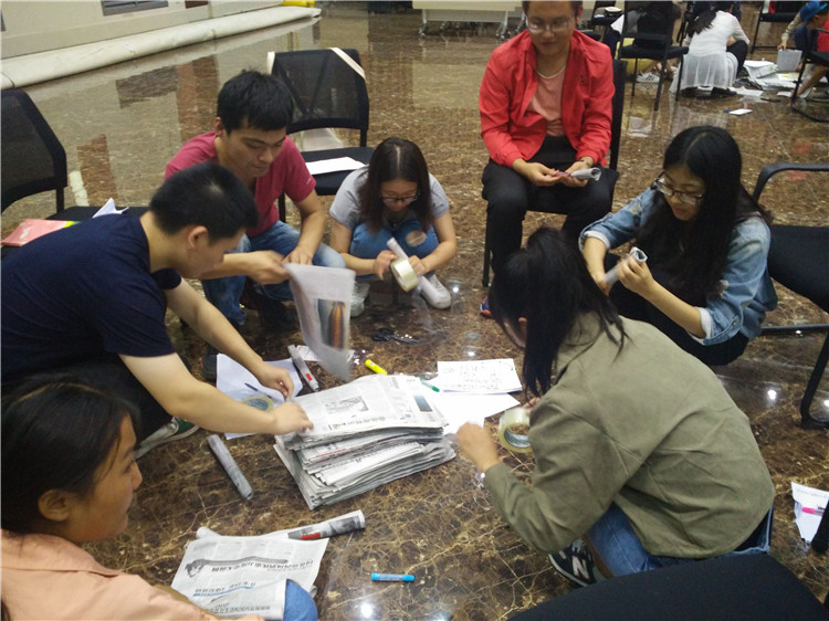 活动过程中,毛老师首先组织同学们进行了别具一格的自我介绍,增进了同学们之间的认识。随后,毛老师将大家分成不同的几个小组,每个小组的同学合作完成老师布置的趣味任务,包括快速介绍小组的其他成员以及用报纸建高塔。在整个活动的过程中,同学们都热情高涨,积极参加,小组成员之间互相配合,现场气氛活跃。