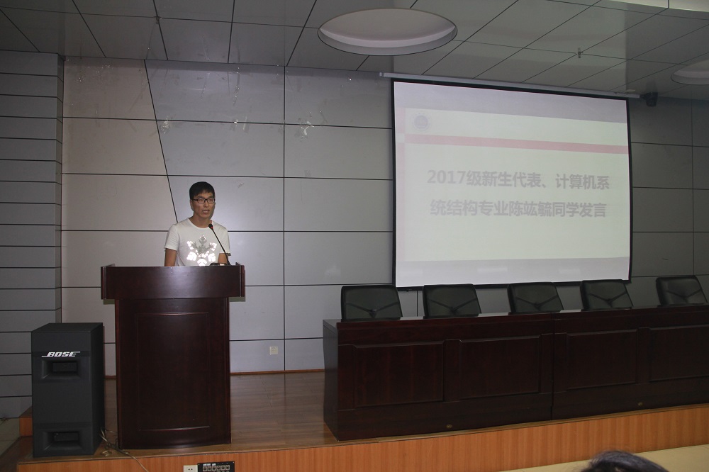 2017级计算机系统结构专业陈竑毓同学代表新生发言。他表达了自己对未来研究生生活的期待与憧憬,表示在之后的学习过程中将有锲而不舍的耐心、开阔视野的信心、承担责任的决心,向着目标勇前进,续写计科梦。