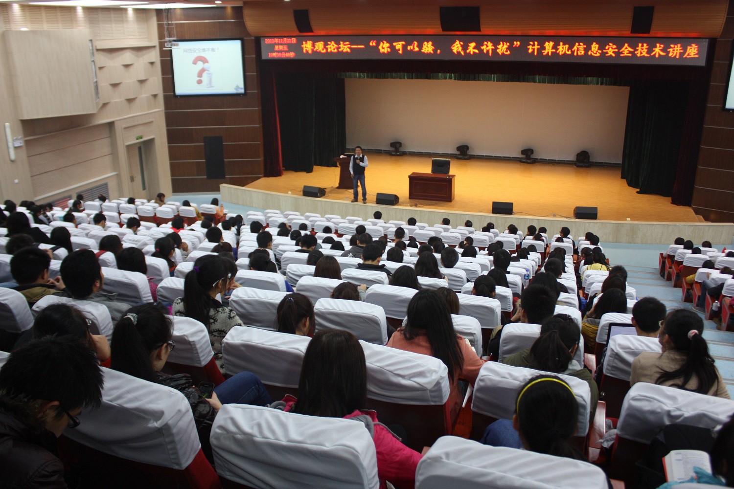 2013年11月22日,由计算机科学学院主办的博观论坛之计算机信息安全技术大家谈活动在新勇活动中心二层学生剧场举办。讲座邀请了西安电子科技大学电子工程学院胡建伟副教授,北京红亚华语科技有限公司总经理郑洪宾,技术部经理任永程为主讲嘉宾,出席活动的还有计算机科学学院副院长吴振强教授,学院党委副书记袁冰老师,团委书记胡雯洁老师。