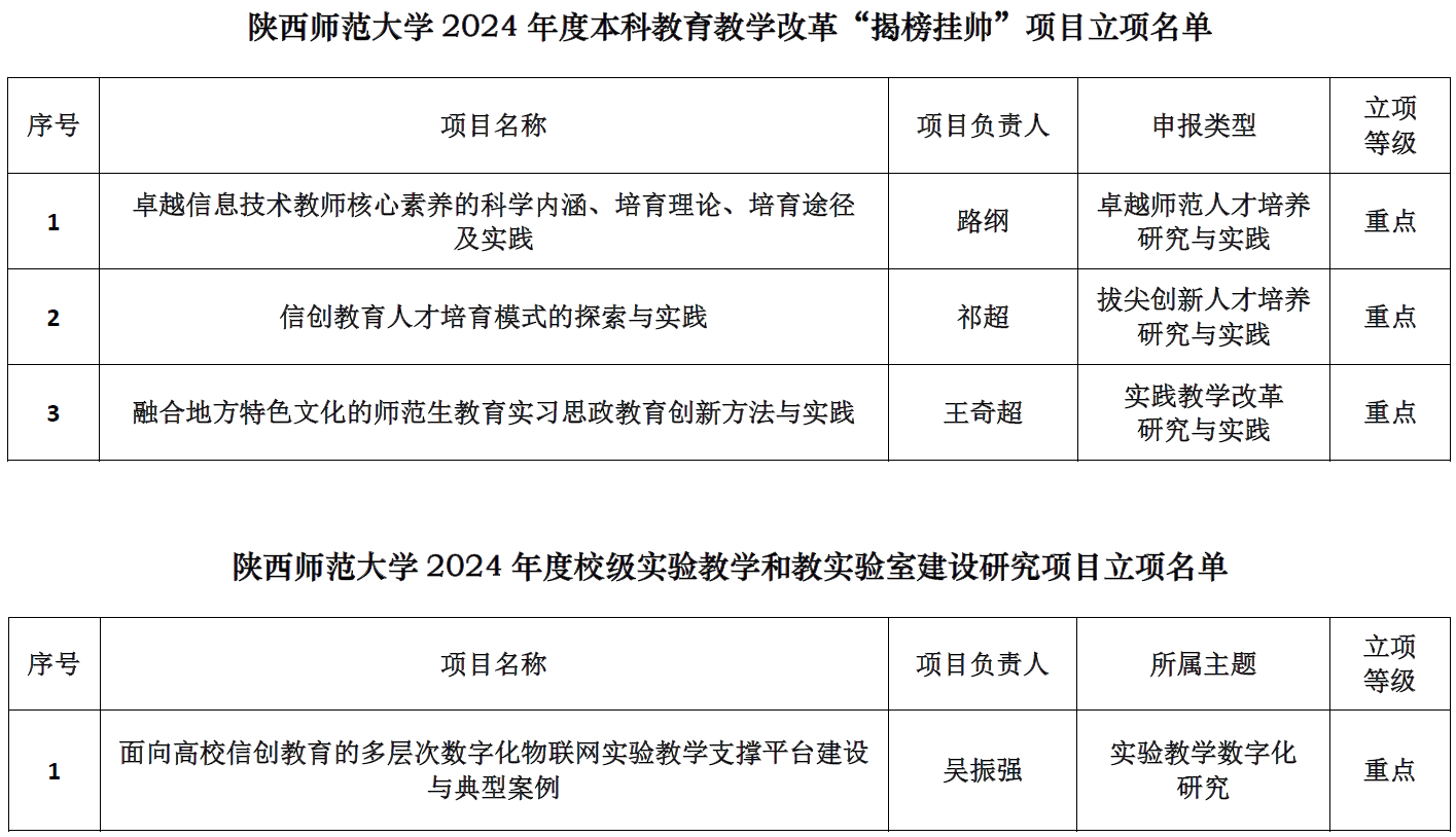 根据《关于做好2024年度本科教育教学改革研究“揭榜挂帅”项目申报工作的通知》《关于推荐申报教育部实验教学和教学实验室建设研究项目的通知》相关要求,经项目组申报、学院推荐、教务处资格审核、专家组评审等程序,龙8在线登录官网-龙8(中国)获批立项校级“揭榜挂帅”教学改革项目3项,其中卓越师范人才培养研究与实践项目1项,拔尖创新人才培养研究与实践项目1项,实践教学改革研究与实践项目1项;获批校级实验教学和教学实验室建设研究项目1项。