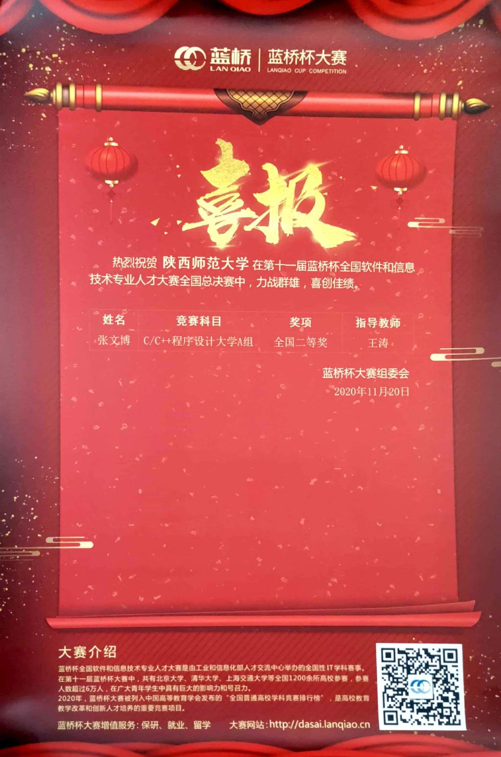2020年11月14日,龙8在线登录官网-龙8(中国)17级学生张文博赴西安邮电大学参加第十一届蓝桥杯大赛总决赛,经过四个小时的紧张比赛,荣获国家二等奖。