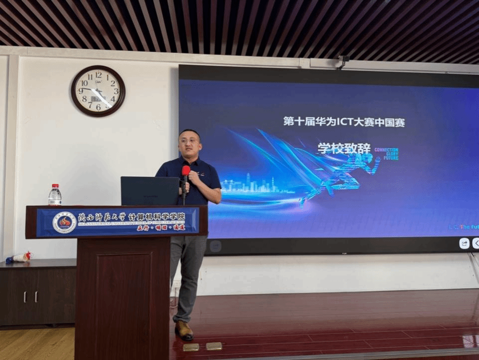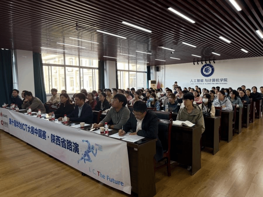 2025年9月23日,陕西师范大学华为ICT大赛路演宣讲会在长安校区文津楼学院报告厅隆重举行。人工智能与计算机学院院长姚若侠、副院长李鹏、2024级辅导员刘中央、张皓然以及学院竞赛负责人王涛老师出席会议。华为陕西人才发展总监谷羽新、华为陕西人才发展经理付皓焱、华为陕西鲲鹏昇腾高校生态经理陈佳俊、泰克教育市场经理王瑶瑶、泰克教育西北教学总监侯向东等企业代表共同出席。部分2024级本科生及后续拟参赛的学生们参加了宣讲会。会议由王涛老师主持。