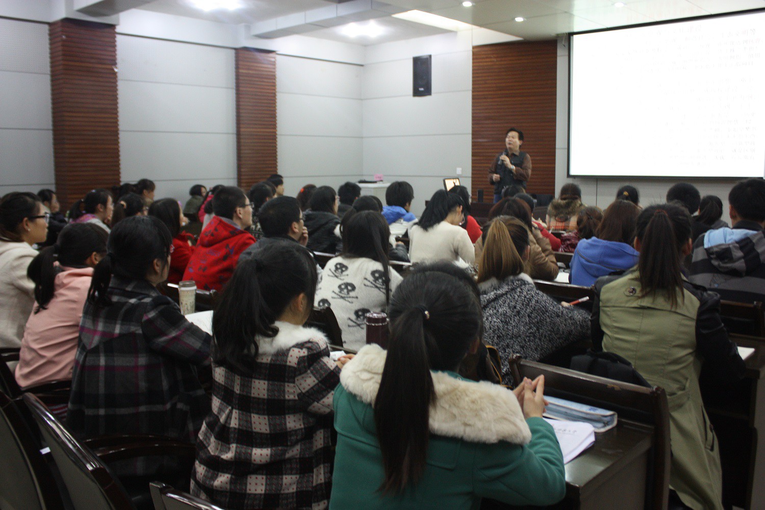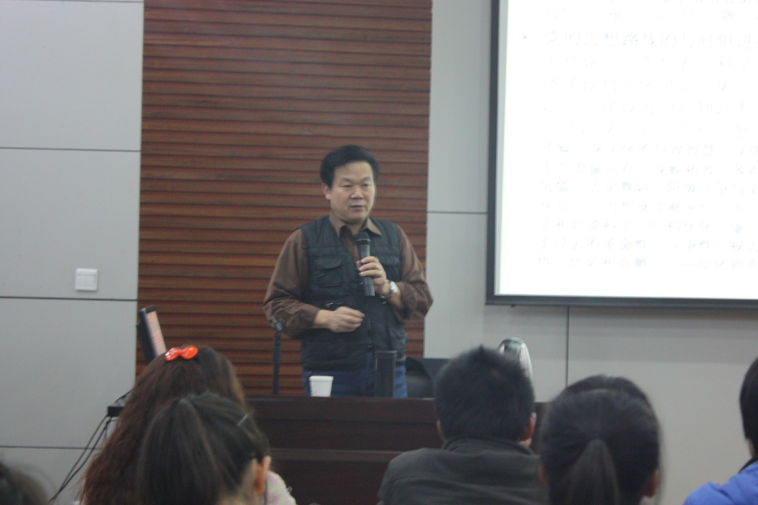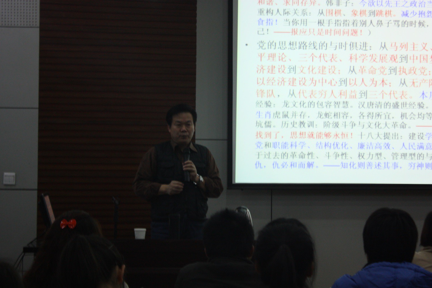 首先,马老师结合历史阐述了科学发展观和文化建设的重要性,教导我们要与时俱进,学会思考,并以2012年诺贝尔文学奖获得者莫言的事迹为切入点,希望当代大学生能够在实事求是的基础上敢于冲破教条主义,挑战权威。接着,马老师详细讲解了学习的三个层次的具体内涵及各层次的意义,使同学们在学习上及思想上都有了新的认识,并通过不同角色和不同利益群体对一则寓言的不同解读,使同学们深刻认识到世界是客观的,而所有结论都是客观的这一理论。最后,马老师以“党员有了正气,党组织才能硬气,人民群众才会服气!”这句极具感染力的话结束了本次课程。此次培训讲座在同学们热烈的掌声中取得圆满结束。
