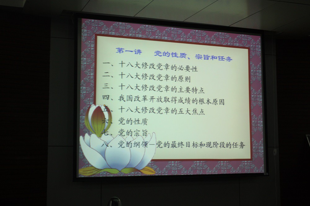 首先,万保民老师向同学们介绍了十八大修改党章的必要性、修改党章的主要特点和原则、我国改革开放以来取得成绩的根本原因和修改党章的五大焦点。随后万保民老师阐述了党的性质及党的宗旨,并通过结合近年来我国发生的具体事件和万老师所教过学生的真实事迹来教导同学要按照党的宗旨带动身边同志一起进步,做出优异的成绩,全心全意为人民服务,维护群众的正当利益,不谋求任何私利和特权。接着万保民老师向同学们详细讲解了党在现阶段的根本任务及党的最低纲领和最高纲领之间的关系,使同学们深刻的理解了党纲的具体内涵。最后,万保民老师希望同学牢记党的性质和宗旨,积极努力,付诸行动,并祝愿同学们早日成为一名光荣的共产党员。此次培训讲座在同学们热烈的掌声中取得圆满结束。