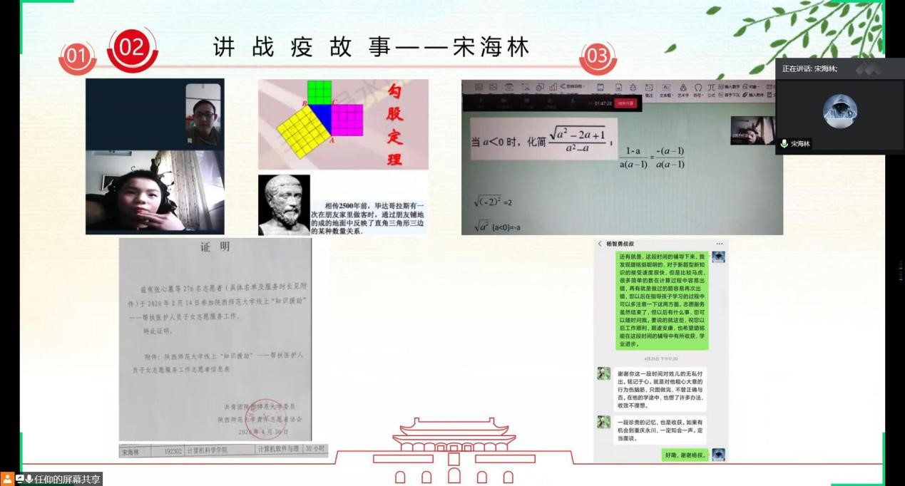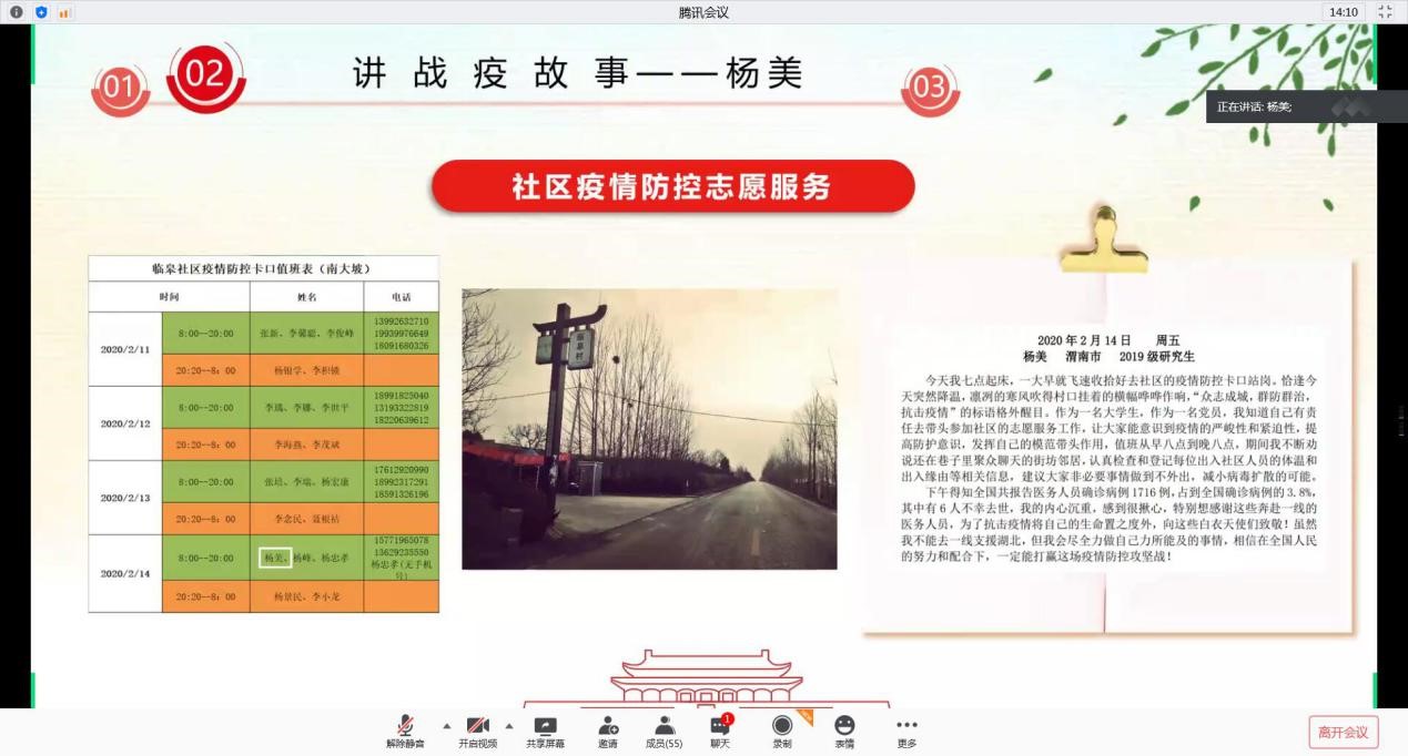 在“讲战疫故事”环节,支部党员胡萌洋、杨美以及积极分子代表宋海林分别围绕疫情期间参与社区一线疫情防控志愿服务、协助处理学院工作、为医护人员子女线上义务辅导等进行分享,三位同志从自己的抗疫故事出发,结合疫情期间所见所闻所思所感,立足自身说故事,真情实感讲体会。