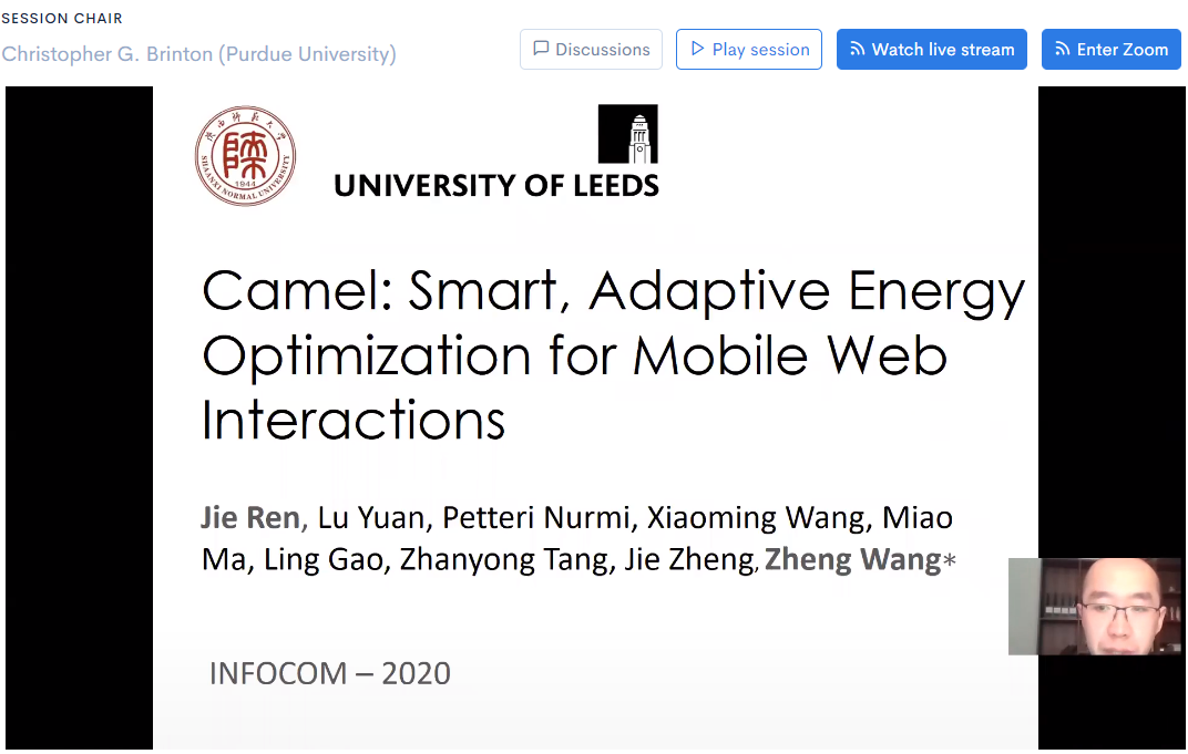 龙8在线登录官网-龙8(中国)青年教师任杰博士为第一作者,与西北大学、芬兰赫尔辛基大学和英国利兹大学的研究人员合作完成的研究成果“Camel: Smart, Adaptive Energy Optimization for Mobile Web Interactions”,在国际电气和电子工程师协会(IEEE)主办的计算机网络国际顶级学术会议INFOCOM 2020以长文形式发表,也是我校计算机领域的研究论文首次在国际顶级学术会议发表。由于新冠肺炎疫情原因,该会议于2020年7月7日在线上召开,任杰博士在大会上做了视频报告。