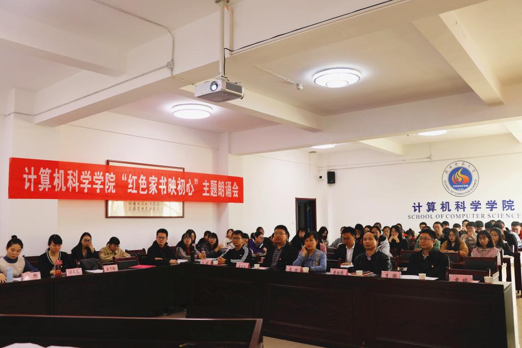 为推进学院“不忘初心、牢记使命”主题教育工作深入开展,增强主题教育的感染力,11月13日下午,龙8在线登录官网-龙8(中国)特色主题党日活动“红色家书映初心”朗诵会在学院文津楼报告厅顺利举办。学院党委书记黄怀平、院长王小明、副书记袁冰,行政党支部书记、副院长董春生,计算科学与软件工程党支部书记祁超、普适计算党支部宣传委员李鹏、普适计算支部党员董蓓、学生党支部书记陈应权,学院本科生、研究生各支部党员、学院马列理论读书社、学生会部分成员到会参加了学习交流。会议由党委秘书郭康凌主持。