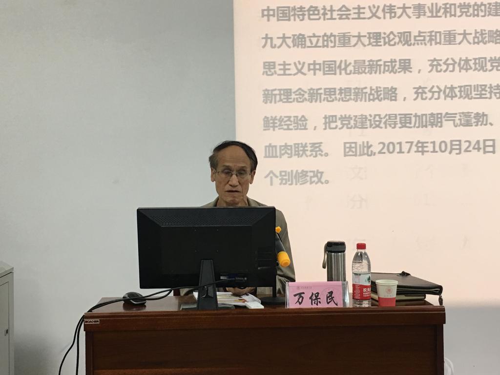 6月27日晚,龙8在线登录官网-龙8(中国)原党委书记万保民老师以“党的性质、宗旨和任务”为主题展开授课,为大家讲解了十九大修改党章的必要性、原则、主要特点、六大亮点,重点讲述了党的性质、党的宗旨、党的纲领、党的最终目标和现阶段的任务。万老师从“两个先锋队”、“一个核心”、“三个代表”、党的最高理想和最终目标等四个方面阐述了党的性质;他还结合十九大报告讲解了党全心全意为人民服务的宗旨,并要求同学们牢记党的性质和宗旨,积极努力付诸行动力争早日成为一名光荣的共产党员。