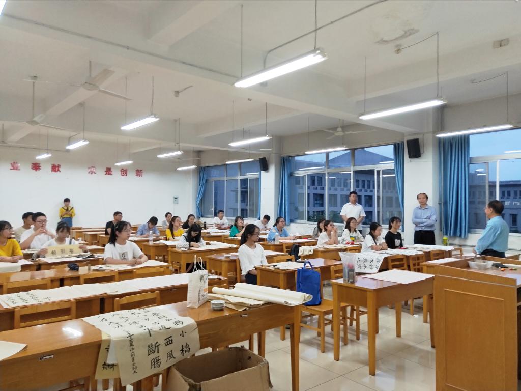 王小明院长随后为书法班致辞。他表示,书法的练习是我们一学期的收获,也将成为我们一生的情怀和宝贵的精神财富,他对同学们提出希望,鼓励同学们在未来的学习生活中都能够坚持修习书法、修养心性、磨练意志,在学好自己专业技能的同时加强自身人文素养。到现场的各位老师也与同学们一起交流书法心得,王老师还为同学们留下了墨宝。