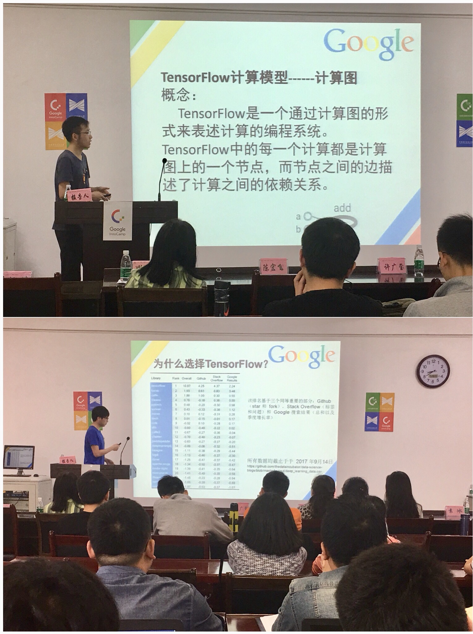 活动伊始,曹菡教授介绍了2018年谷歌全国创新特训营峰会活动及中美青年创客大赛,鼓励龙8在线登录官网-龙8(中国)同学积极参加中美青年创客大赛。她强调了举办本次创新特训营活动普及Google人工智能前沿技术、培养龙8在线登录官网-龙8(中国)师生创新能力、引导学生研究性学习的意义。接着计算机科学学院研究生张延介绍了Google人工智能技术开源软件TensorFlow的入门基础知识,讲解了如何安装软件及搭建TensorFlow环境。计算机科学学院研究生韩思明讲解、演示了如何使用TensorFlow解决花卉识别和MNIST数字识别问题。报告结束后,全体营员在龙8在线登录官网-龙8(中国)软件创客坊进行了实战操作。学生通过安装Anaconda软件和练习经典实例,对Google人工智能技术有了更深刻的认识。活动现场气氛活跃,同学积极踊跃提问、交流。