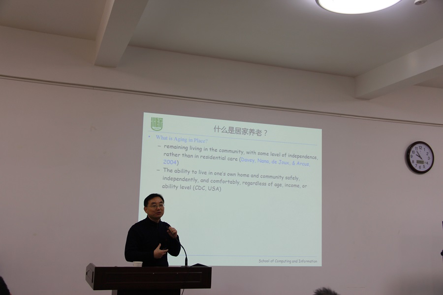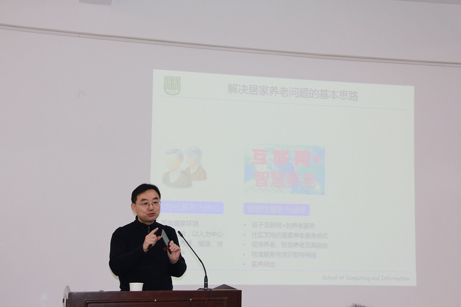 人口老龄化是一个世界性趋势,在未来很长一段时间内,人口老龄化是我国社会发展的常态,这一趋势将对我国经济社会的健康发展带来新的机遇和挑战。在“互联网+”时代,物联网已经深刻地融入了社会生活的各个方面,讨论物联网等新兴信息技术在解决养老问题中可能发挥的作用以及智慧养老的内涵与功能是当前研究的一个热点话题。为提高龙8在线登录官网-龙8(中国)师生科研水平、加强工程硕士对当前新兴产业的了解。2017年12月30日,受龙8在线登录官网-龙8(中国)网络与信息安全团队吴振强教授邀请,滁州学院陈桂林教授在文津楼三段学院报告厅做了题为“面向居家养老的智慧健康照护”的学术报告。报告由龙8在线登录官网-龙8(中国)副院长董春生主持,龙8在线登录官网-龙8(中国)部分教师、博士、硕士研究生聆听了此次报告。