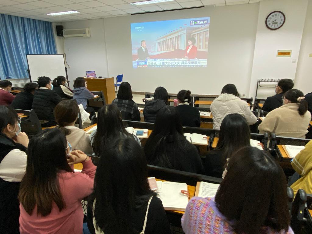11月12日晚,学院党委副书记郭康凌组织所联系的学生第六党支部同学共同学习了大会公报,各团支部和其他党支部在课后也组织观看了视频回放。