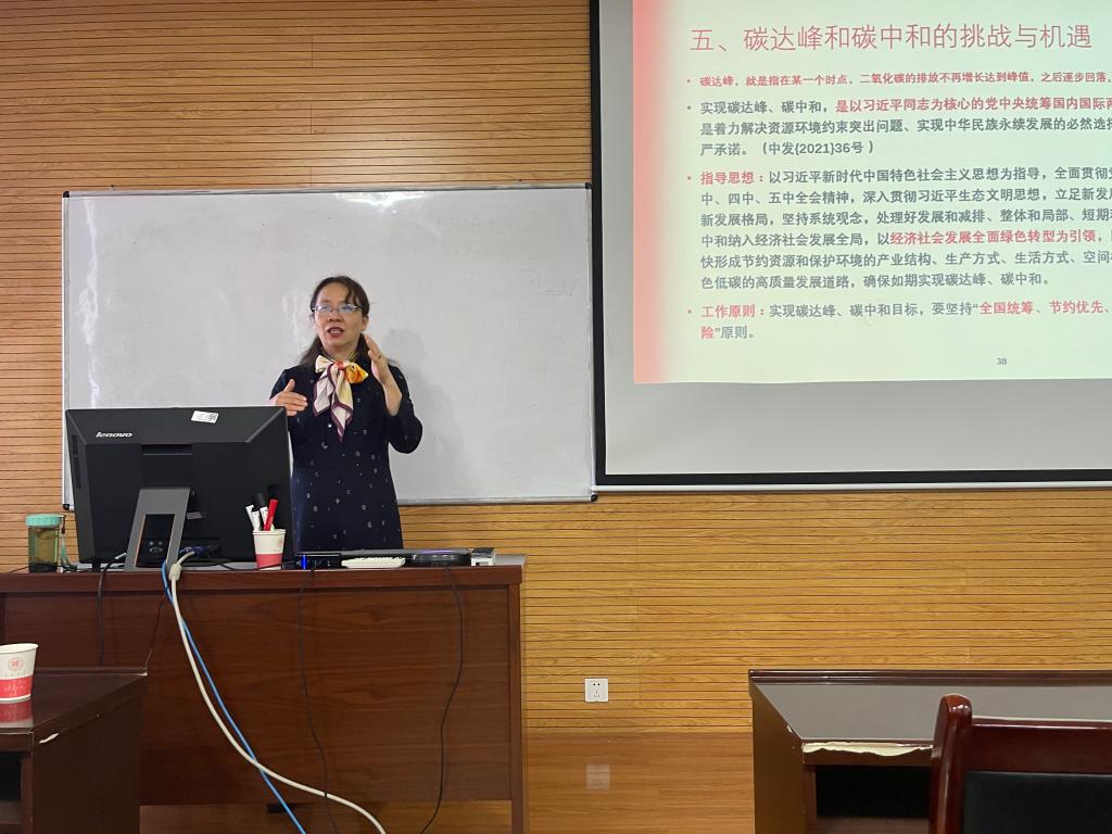 杨祖培首先回顾了百年党史,向与会党员明确了“学党史,悟思想,办实事,开新局”的重要意义,并表示在向着第二个百年奋斗目标进军的过程中,努力实现“碳中和”将是中国共产党领导的中国为人类可持续发展做贡献的伟大实践,是中国能源革命的里程碑,也是第二个百年的一场硬仗。她结合对二氧化碳来源与去向这一问题的探讨,从实现“碳中和”的时代背景、主要内容、实现路径、“碳达峰”和“碳中和”的挑战与机遇等方面进行了讲解。