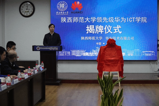 会上,陈新兵、姚若侠、张艳兵与孙岳江、王国兵、谷羽新共同为陕西师范大学“领先级华为ICT学院”揭牌。