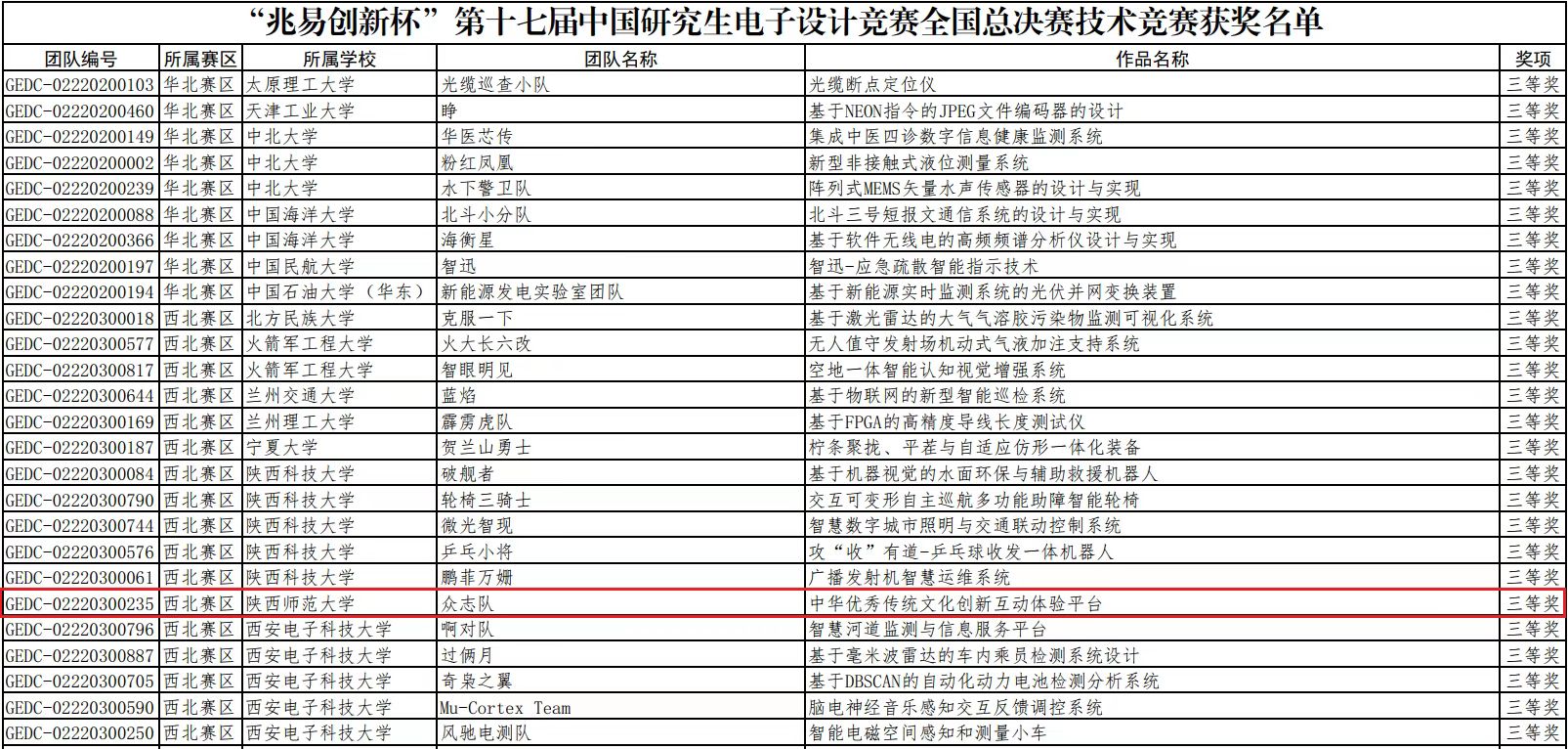 中国研究生电子设计竞赛是由教育部学位管理与研究生教育司指导,由中国学位与研究生教育学会、中国科协青少年科技中心、中国电子学会联合主办的研究生学科竞赛。本次比赛共有来自全国三百余所高校及科研院所的5824支队伍参赛,近20000名研究生参加,579支队伍经过东北、华北、西北、华中、华东、上海、华南、西南8个分赛区的角逐脱颖而出,参加本次总决赛。龙8在线登录官网-龙8(中国)吕小姣等的作品《基于VR技术的陕北民歌多模态交互系统》荣获全国一等奖,获奖率仅为1.7%,为我校在该项赛事中的历史最好成绩。