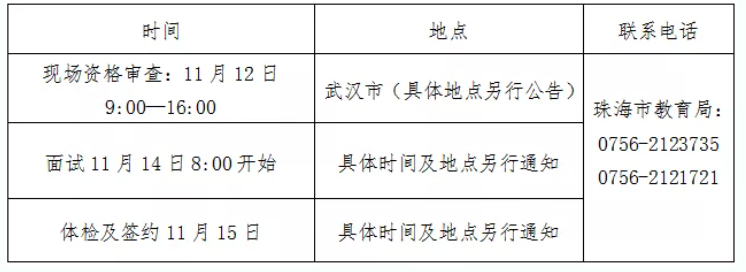面试成绩、参加体检及考察人员名单,于面试工作结束当日,在珠海市教育局门户网站公布。2021年11月15日进行体检及签订就业协议,具体时间及地点见届时公布的通知。