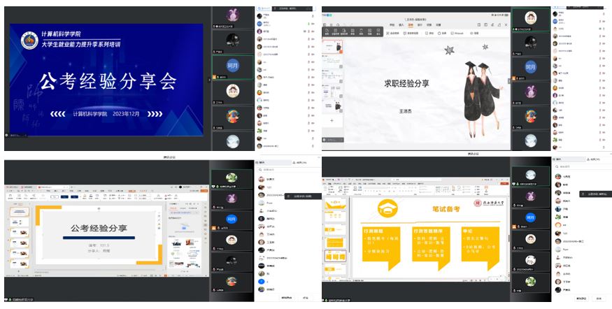 为帮助备战公考的学生提升对相关报考政策和备考流程的了解和掌握,使同学们科学规划时间、提高效率、合理备考,计算机科学学院于12月23日晚19:00举办公考经验交流分享会。本次会议采用线上分享的方式,由研究生辅导员袁珂月主持,计算机科学学院2023届毕业生王沛杰、周耀和梁昕钰进行经验分享,学院2021级、2022级研究生参加了经验分享会。