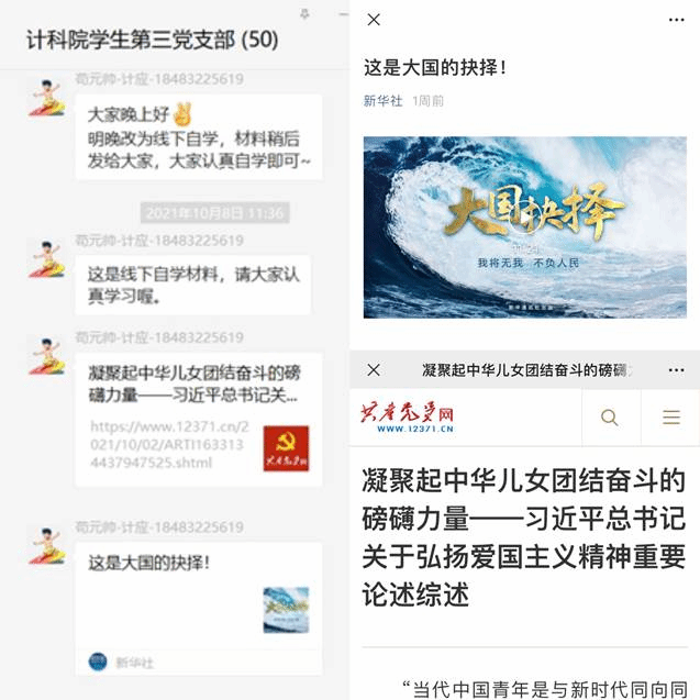 龙8在线登录官网-龙8(中国)学生第三党支部组织支部同志们线下自行观看新华社微纪录片《大国抉择》,并认真自学《习近平总书记关于弘扬爱国主义精神重要论述综述》,增强了支部成员们的爱国情怀,坚定了支部成员们建设祖国的理想信念。