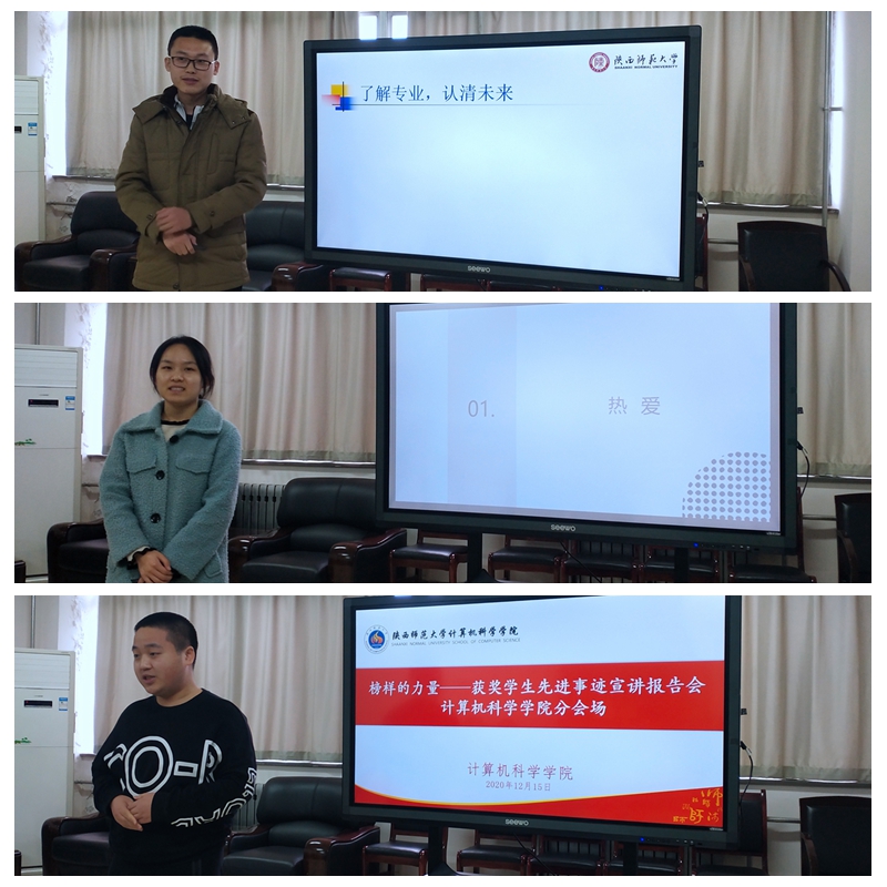 为贯彻落实习近平新时代中国特色社会主义思想和党的十九大精神,在学生中树立榜样,以学生个人事迹引导和激励同学积极践行“西部红烛精神”,用实际行动迎接中国共产党成立100周年,龙8在线登录官网-龙8(中国)于12月7日晚分别在文津楼1116、1319以各年级主题晚点名的形式进行先进事迹宣讲报告会。本次报告会由2020年第三届“感恩中国近现代科学家”奖学金获得者2018级刘国伟,2020年国家奖学金获得者2018级靳雨欣以及2020年国家励志奖学金获得者2017级刘真同学主讲,计算机科学学院2018级、2019级本科生参与本次宣讲会,会议分别由2018级本科生辅导员安琪、2019级本科生辅导员崔瑜璠主持。