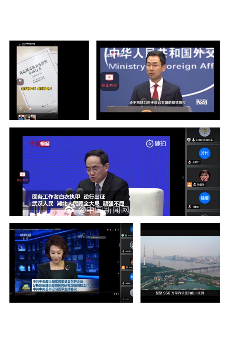 会议开始,主持人陈慧洁介绍了本次会议的主要流程和《抗击新冠肺炎疫情的中国行动》白皮书的主要内容,小组成员分享了心得体会。马金丽分享了知乎抗疫短片——《三十三》,她谈到:“在抗击疫情的艰辛历程中,14亿人众志成城,可敬的白天使逆行守护人民生命健康安全,他们披上了铠甲,像磐石一样坚毅。”金芳竹分享了央视新闻联播中报道的我国政府在抗击新冠肺炎疫情中做出的积极作为,她谈到:“新冠肺炎疫情的防控工作很艰难,但是我国始终把人民生命健康放在第一位,为别国做出了榜样。”桂榕也讲了自己的亲身感受,她分享了我国外交部回应外媒的视频,她说:“我国政府坚持人民至上,生命至上,可以看到我国在外交上的强大,不受制于他人。”白鑫谈到:“生命高于一切,《抗击新冠肺炎疫情的中国行动》白皮书真实记录的中国做出的关键成效,凝结中国14亿人共同的记忆。在疫情过程中,我们看到了习近平总书记的果断决策,看到了中国共产党和中国政府论的果断行动,作为新时代青年,我们有责任有义务承担起时代大任,为实现中华民族伟大复兴贡献自己的力量。”陈慧洁也做出了自己的分享,《抗击新冠肺炎疫情的中国行动》白皮书用一条条数据记录了中国抗疫的真实故事。一个个生动的案例,抗击疫情中的每一次作为和决策都让国人为之骄傲,我们深刻体会到了作为中国人的自豪感。