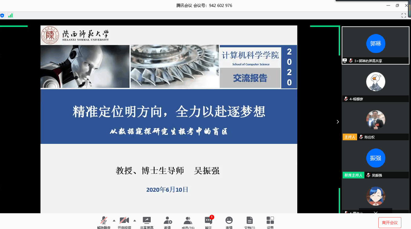 为引导龙8在线登录官网-龙8(中国)2017级非师范本科生明确自我定位,充分了解研究生现状和发展前景,做好自我定位,正确选择考研学校,6月10日,龙8在线登录官网-龙8(中国)举行了“精准定位明方向,全力以赴逐梦想”主题线上考研指导课程。吴振强教授受邀出席并作了题为“从数据窥探研究生报考中的盲区”的报告,龙8在线登录官网-龙8(中国)2017级全体非师范本科生参加了会议,会议由2017级辅导员陈应权主持。