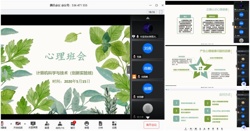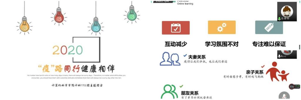 5月16日,计科1702班开展心理班会。班会开始,心理委员张静妍根据同学们的心理状态提出希望同学们理智看待并接纳自己的情绪。接着,周丹蕾和加依娜尔分别从家庭关系和情侣关系入手,通过生动的图像和视频,分析亲密关系中可能会出现的摩擦和相应的解决方法,一些同学主动分享了自身的体会,张静妍还总结了一些常用的沟通技巧。最后,张静妍从三个方面分析“网课焦虑”问题,并提出相应的解决方案。