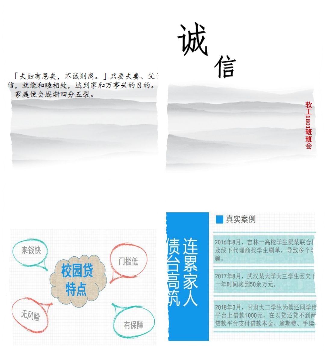 软件工程1801班开展主题为“诚信为本”的线上班会,尽显文学之美。此次本会特邀请到文学院辅导员王秋婷老师共同参与。在班会开始,主持人就“诚信是以真诚之心,行信义之事”开始,先后引用唐代名臣魏徵、《左传》、孔子、王安石的言语,论证诚信在待人、治国、接物、朝政方面的重要作用。同学们踊跃发言,争先分享自己收集的诚信故事。文学院辅导员王秋婷老师强调,诚信是根本之道。班会同时就“校园贷”的识别和防范进行讲解,提醒大家要远离校园贷,培养防范意识,不盲目攀比,合理安排支出。辅导员安琪老师谈到,诚信体现在方方面面,不论大小,我们都应坚守。