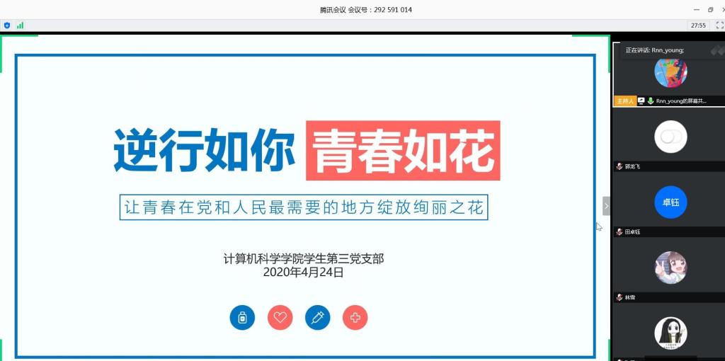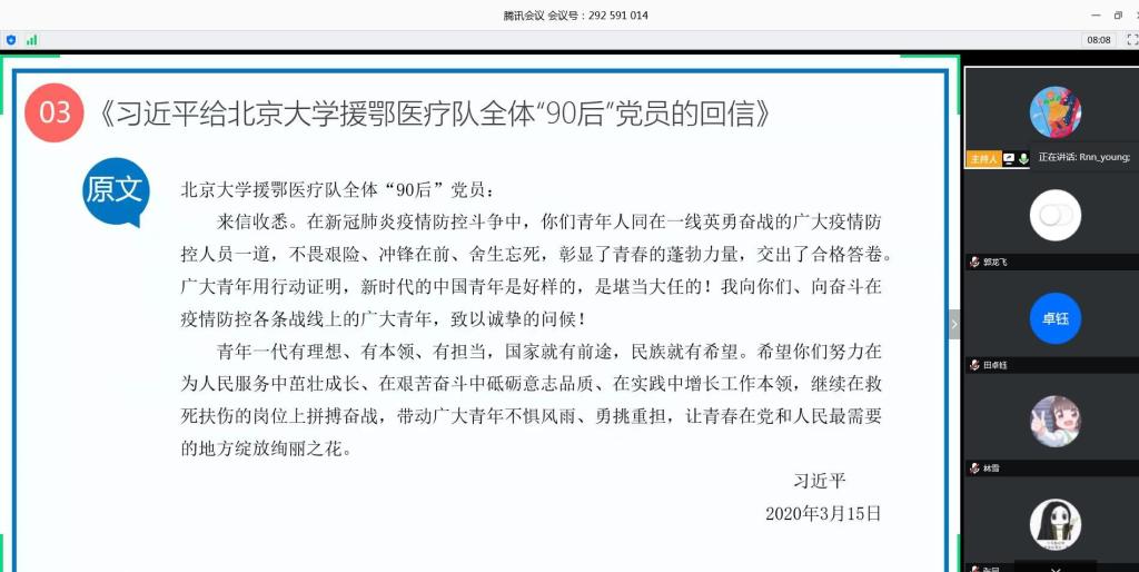 为加强支部建设,凝聚党员思想共识,进一步发挥党组织战斗堡垒作用和党员先锋模范作用,龙8在线登录官网-龙8(中国)学生第三党支部于2020年4月24日通过腾讯会议召开“逆行如你 青春如花”主题党日活动。