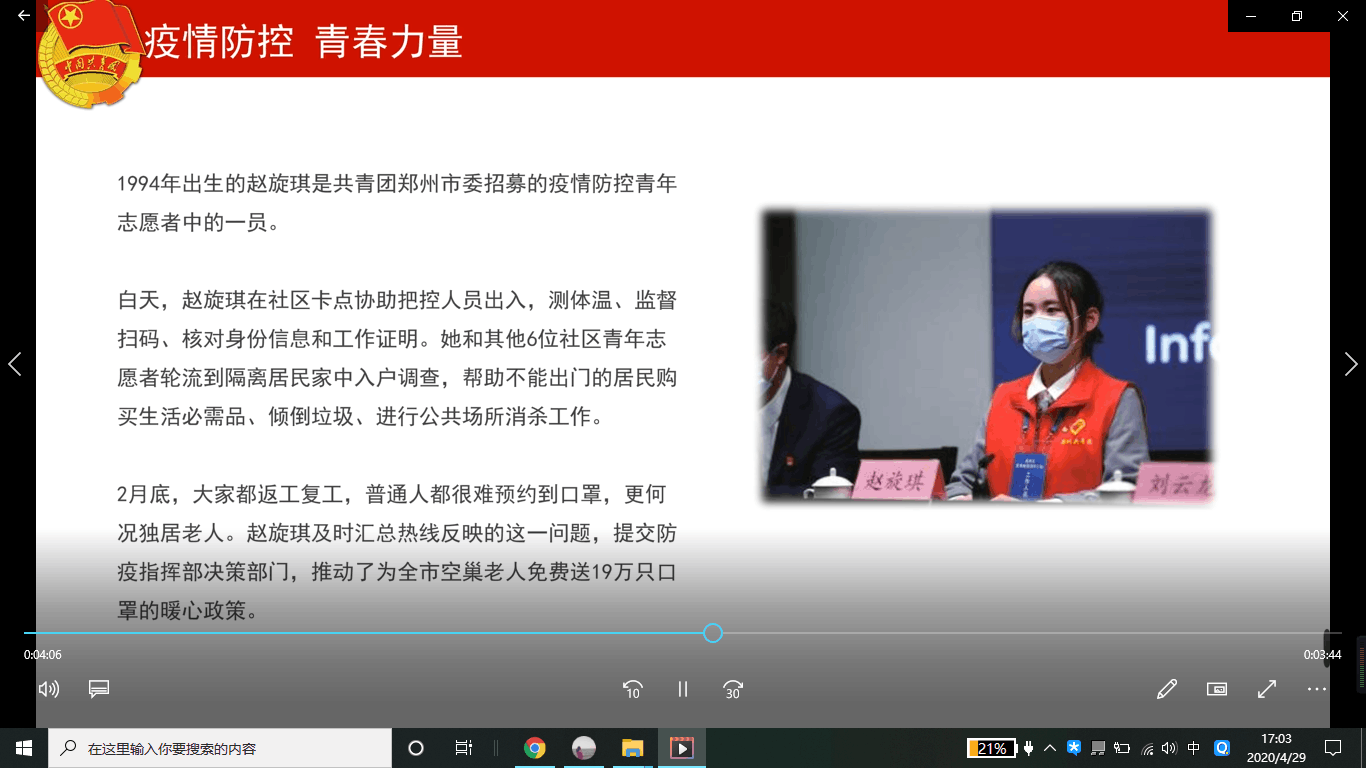 为深入学习贯彻习近平新时代中国特色社会主义思想,认真贯彻落实习近平总书记关于疫情防控工作的一系列重要指示批示精神,持续夯实“三会两制一课”制度和我校共青团基层团组织“活力提升”工程,创新团课教学形式,2020年4月20日,龙8在线登录官网-龙8(中国)团委组织开展了“携手战疫情 青春爱国行”微团课创作录制。4月29日上午,辅导员及学院团委工作人员对各团支部提交的参赛作品进行播放展示与评议打分。