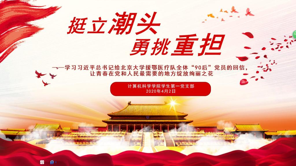 为进一步领会习近平总书记给北京大学援鄂医疗队全体“90后”党员的回信中的重要精神,2020年4月2日晚,龙8在线登录官网-龙8(中国)学生第一党支部开展了“挺立潮头 勇挑重担”主题线上集中学习会议,第二党小组孙乐晴同志主持会议。
