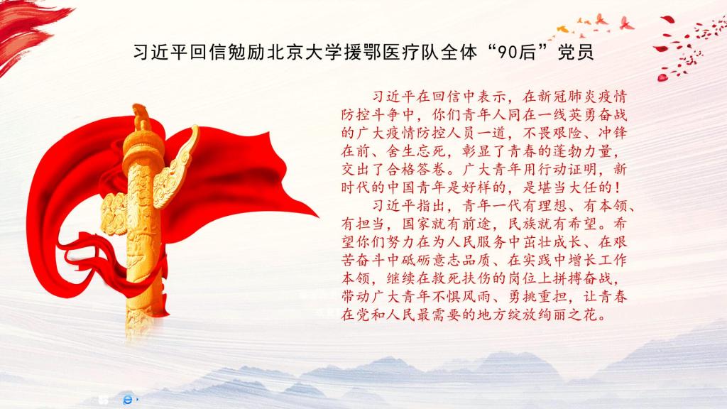首先,在孙乐晴同志的带领下,全体党员学习了习近平总书记给北京大学援鄂医疗队全体“90后”党员的回信内容,并通过一段视频资料一起回顾了众多“90后”党员在此次抗疫过程中的使命与担当。