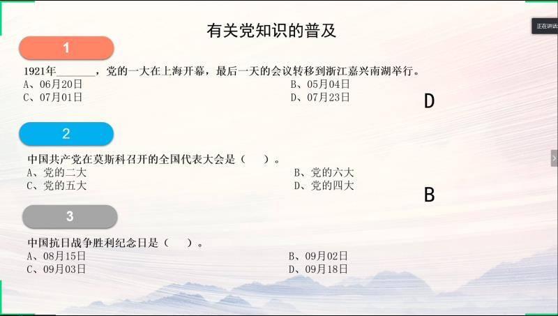 会议第二项,支部还开展了党章党史知识普及,对于每一个问题,党员同志们纷纷在评论区积极回复,踊跃回答。特别的,叶琳琳同志向大家讲述了党的一大召开时间与党的生日日期不同的原因,贾茹同志分享了中共六大在国外召开的原因,陈依敏同志介绍了中国抗日战争胜利纪念日的由来。