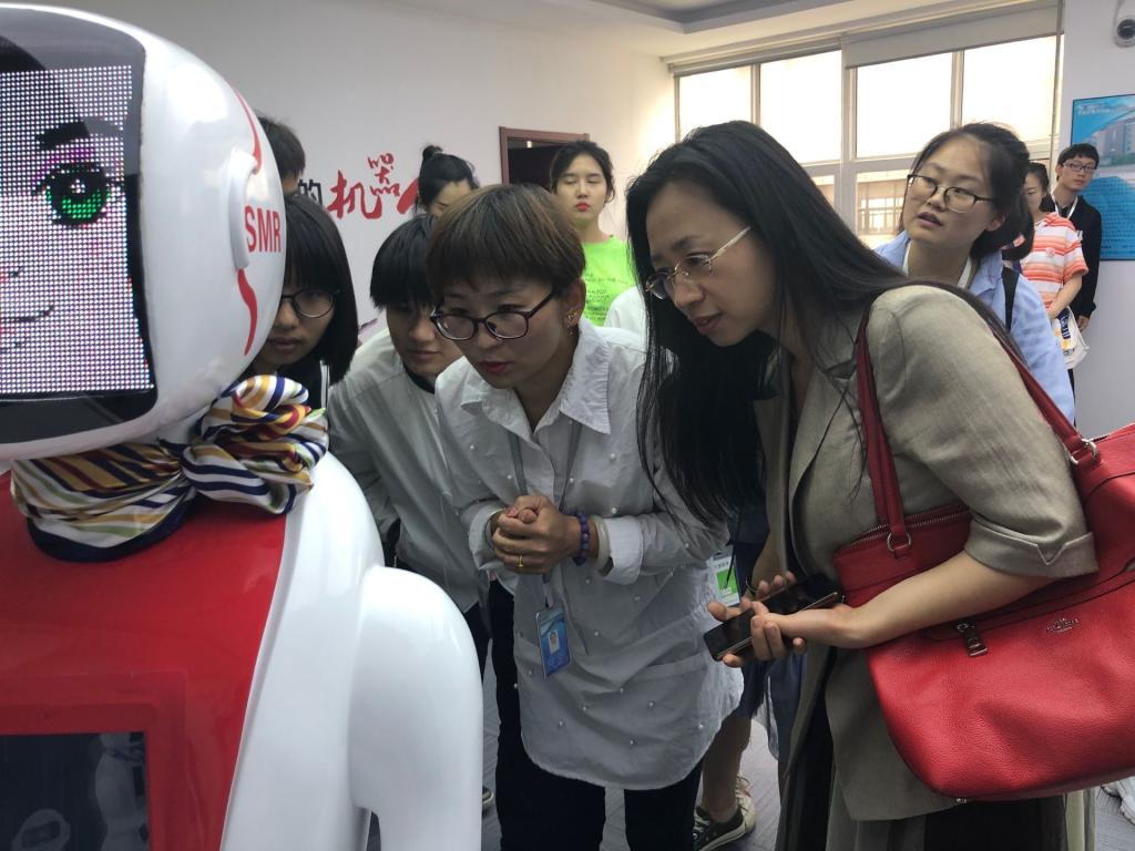 上午9时,在软通动力HR吕游的导引下,师生有序参观了腾讯双创空间和京东云电商创新中心,由相关工作人员介绍其功能和已经入驻的企业,讲解了国家对大学生创新创业的支持政策,增强了同学们对于创新创业的了解。接着,大家参观萨摩尔机器人场地,了解送餐机器人的工作原理,更是在现场与机器人进行互动,激起了同学们对学习人工智能的浓厚兴趣。