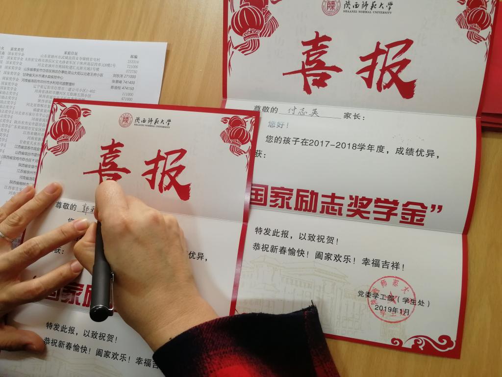 为响应学校号召,表彰优秀学生,增进家长对学生在校情况的了解,共同促进学生成长成才,根据龙8在线登录官网-龙8(中国)2018年度国家奖学金、国家励志奖学金、明德奖学金、叶圣陶奖学金、文源奖学金、感恩中国近现代科学家奖学金、隆基奖学金、海亮奖学金等奖项的获奖名单,学工组袁冰、郭康凌、毛庆、陈应权、卫晓等几位老师亲自为同学们书写喜报。学工组老师们提前通过电话、QQ等方式跟学生取得了联系,确认家庭住址、收件人、邮编等信息,确保了每一封喜报都能准确无误的送达到每一名家长的手中。