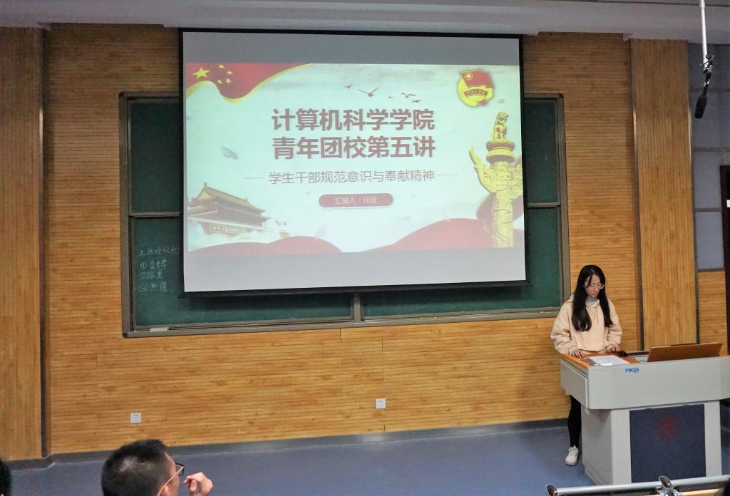龙8在线登录官网-龙8(中国)青年团校培训班第五讲于11月25日晚在雁塔校区顺利举行。学院学生会副主席、2016级计算机科学与技术(创新实验班)任欣做了题为《学生干部规范意识与奉献精神》的报告,龙8在线登录官网-龙8(中国)2018全体学生干部参加了此次培训。