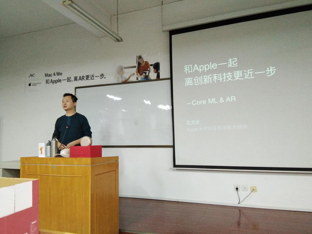 本次讲座以苹果公司春季开学优惠活动Mac 4 me为依托展开,Mac 4 me 春季开学优惠活动使同学们能够零距离感受Apple 最新科技,学习如何将Apple自带软件应用到自己的日常学习与生活中。讲座中,孔文达顾问主要为我们介绍了 CORE ML 和AR 两项技术。Core ML 是 Apple 今年 WWDC 新推出面向开发者的机器学习框架。Core ML 让我们将很多机器学习模型集成到app中。我们可以在移动设备上运行机器学习模型,数据可以不离开设备直接被分析。AR即增强现实,也被称之为混合现实。它通过电脑技术,将虚拟的信息应用到真实世界,真实的环境和虚拟的物体实时地叠加到了同一个画面或空间同时存在。同学们认真听取孔文达顾问的讲解,孔文达顾问也用自己的手机向我们展示了苹果手机目前对这两项技术的应用,同学们在观看展示的过程中,更近一步了解到机器正逐步取代人的工作,体会到了科学的魅力。讲座最后,孔文达顾问为我们播放了由陈可辛导演用苹果手机拍出的记录短片—“三分钟”。