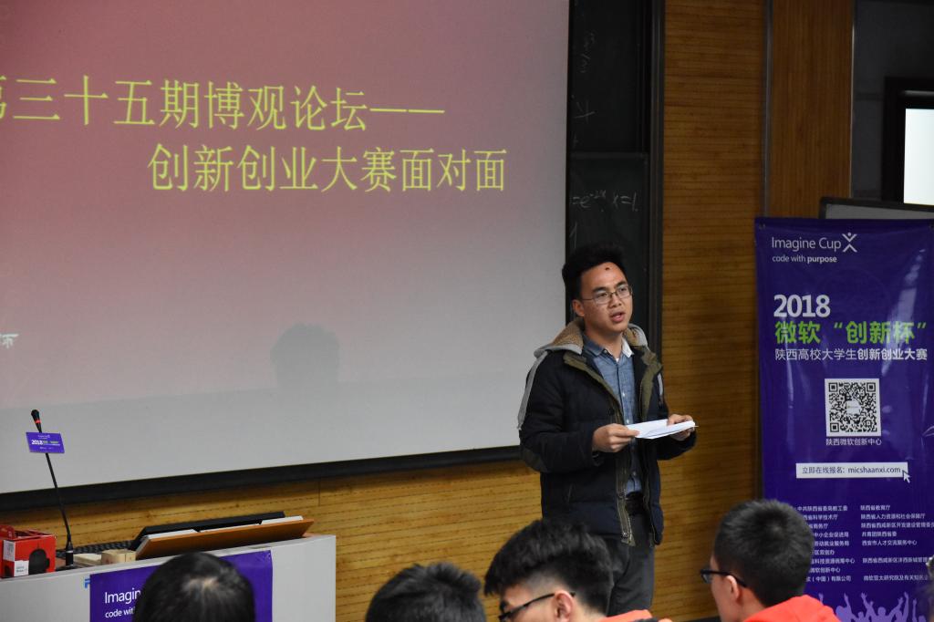 本次宣讲会的主讲人是陕西微软创新中心市场经理、教育部首批创业导师董理。董理讲到此次大赛以“活力激扬、非同凡想”为主题,积极号召大学生参与,鼓励投身科技创新,旨在进一步强化大学生创新创业实践,努力培养“大众创业、万众创新”的生力军,对提高当代大学生创新能力具有重要作用。