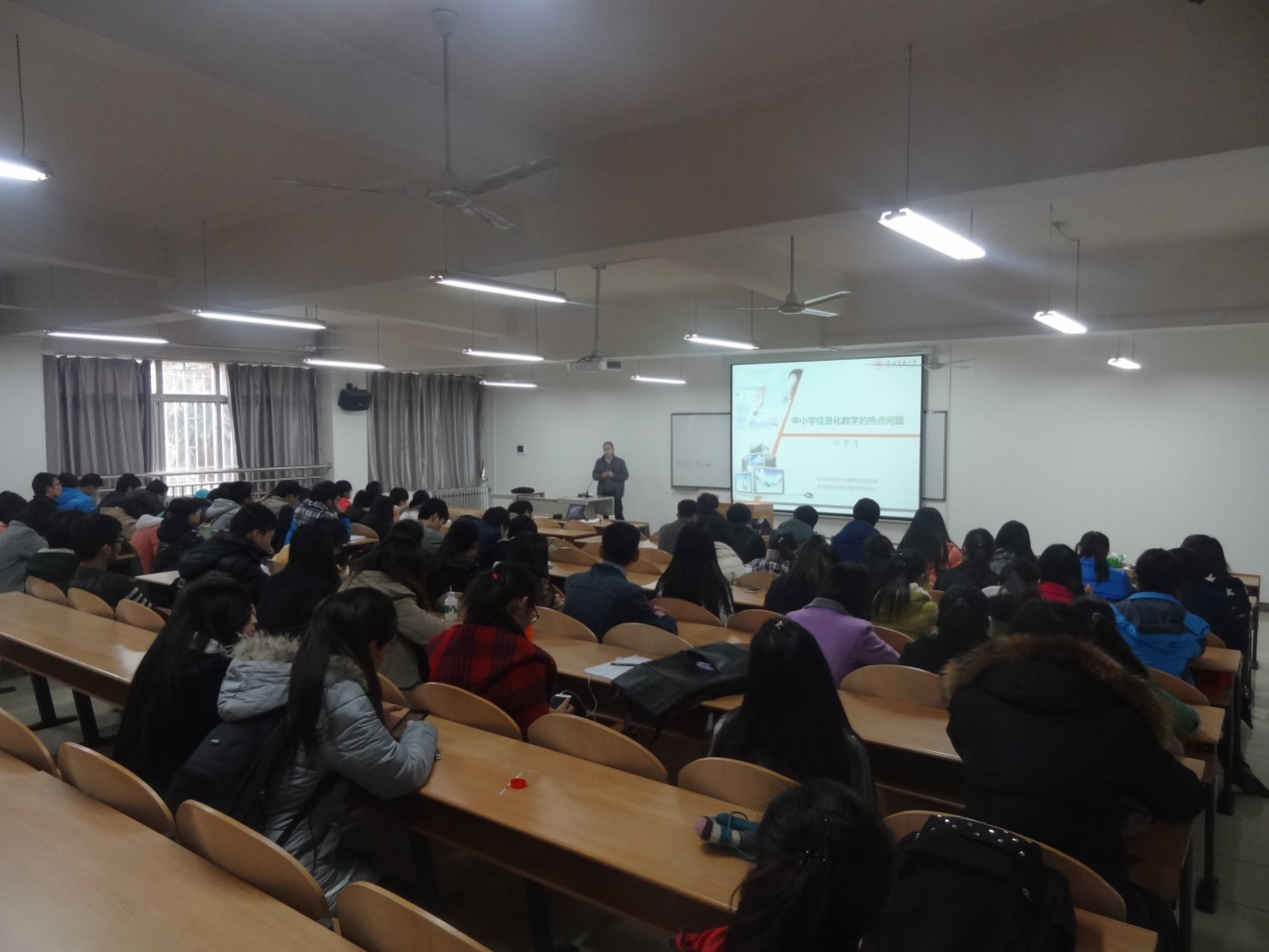 12月31日,龙8在线登录官网-龙8(中国)计科师范专业举行了一次专业发展报告会,由陕西师范大学教师专业能力发展中心副主任、国家“985教师教育创新平台”技术负责人、陕西省基础教育学会理事何聚厚副教授为与会师生做了题为“中小学信息化教学的热点问题”的精彩报告。何老师指出,教育技术经历了传统时代、多数媒体时代之后已经发展到了当今的泛在智能时代,BYOD(用户自带设备)为当代教师将教育理念变为现实提供了巨大支撑;当前技术和教育融合不理想的责任主要在教师;要实现习近平主席倡导的“人人皆学、处处能学、时时可学”,则教育理念和教育模式的深刻变革是关键;“互联网+教学”已经迫在眉睫等。何老师还就热点问题如创客教育、翻转课堂等谈了自己的亲身体会并举了不少生动鲜活的实际例子。报告会开拓了我专业学生的眼界,激发了学生的兴趣、引起了他们的思考。在会议结束时当场进行的调查中,许多同学表示很有收获。