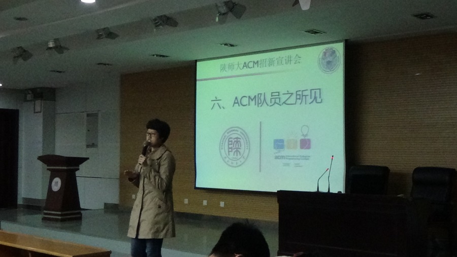 首先,我校ACM竞赛队教练王涛老师向同学们介绍了ACM-ICPC(即ACM国际大学生程序设计大赛)的竞赛规则、赛制、我校ACM队的发展历程,使在场同学了解到了这个号称“程序设计界的奥林匹克”的国际性赛事。现场大部分同学对于此项赛事表现出了浓厚的兴趣。