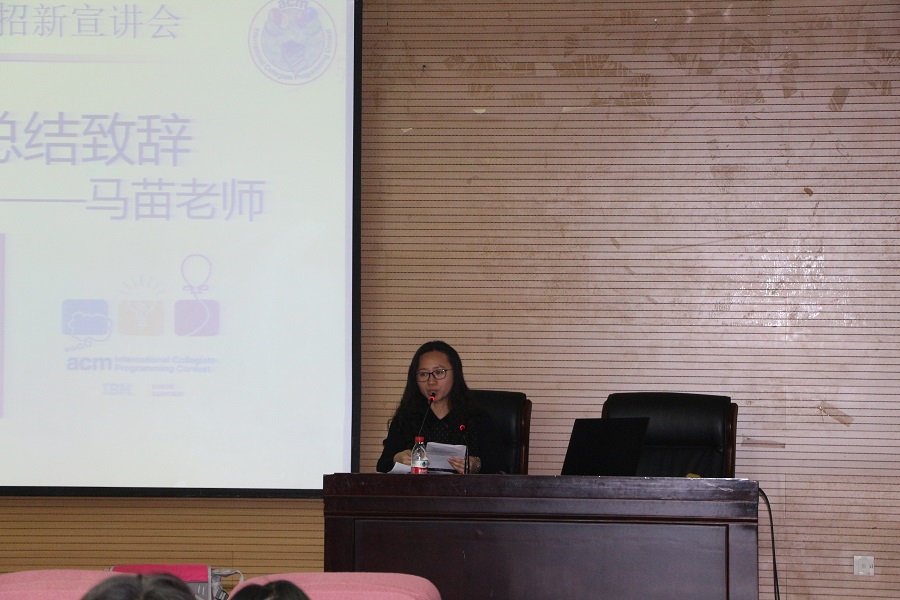 宣讲会最后,计算机科学学院副院长马苗老师讲话。马院长肯定了ACM竞赛的重要性,深入剖析了ACM竞赛对信息类专业教学模式带来的推动与促进作用,并表示学校与学院也将更加支持我校ACM竞赛的发展。她鼓励同学们热爱专业、刻苦钻研、勇于创新,鼓励同学们积极参加ACM竞赛,拓展自身专业能力,增强自身专业水平。