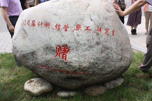 在校庆70周年来临之际,龙8在线登录官网-龙8(中国)2014届毕业生为学院赠送了刻有 “计科梦”的泰山石,以表达自己对学院培养的感激之情。龙8在线登录官网-龙8(中国)院长李永明,党委书记胡波,副书记袁冰,副院长裘国永、吴振强、刘侍刚、许广玺,毕业生辅导员和本科生、研究生代表出席了此次活动。