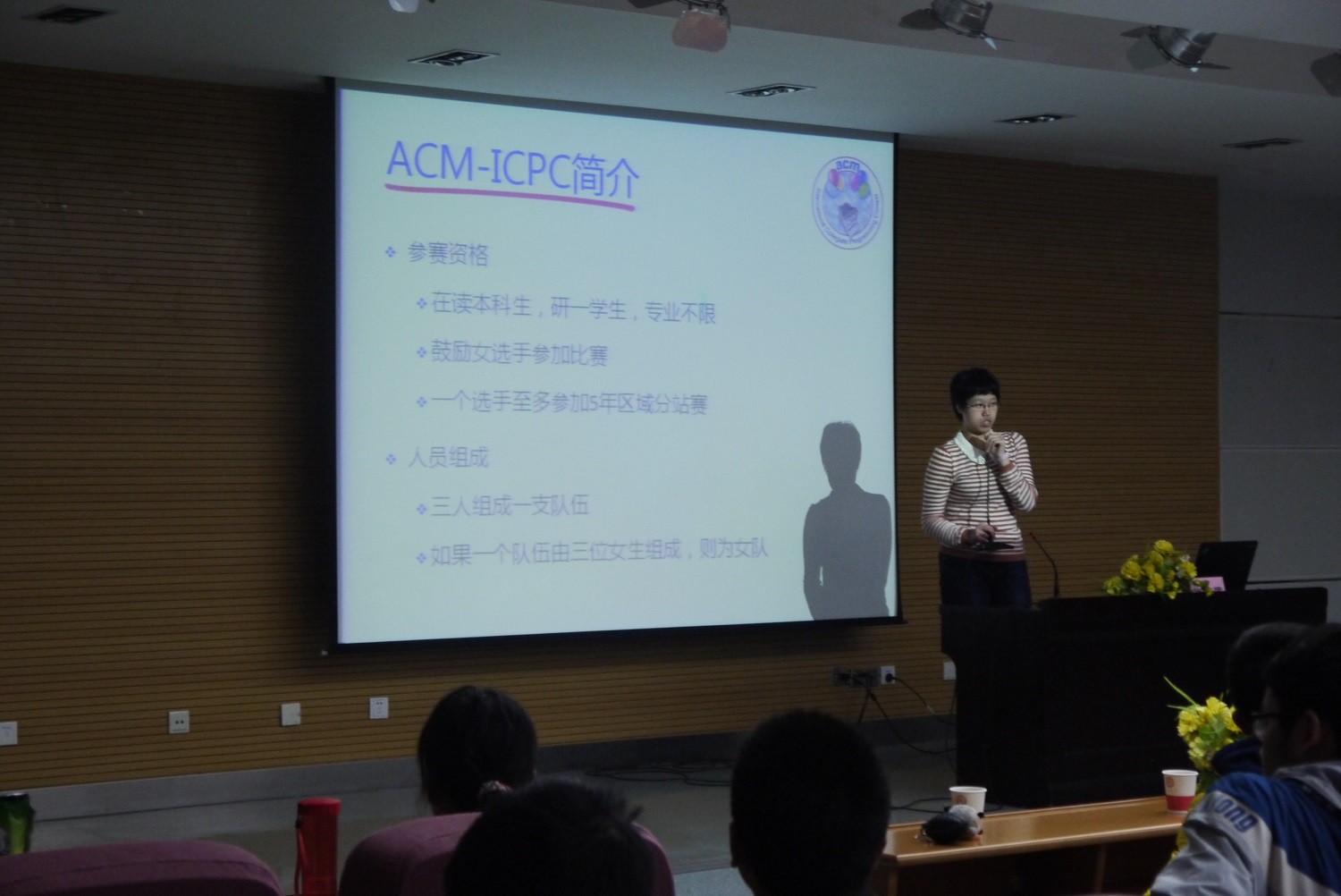 11月8日晚,ACM-ICPC竞赛雁塔校区宣讲会在崇鋈楼三层归仁堂举行,计算机科学学院副院长吴振强教授、党委副书记袁冰老师、团委书记胡雯洁老师和理工科基础教学部辅导员杨涛老师出席了宣讲会。首先,我校ACM竞赛团队成员张瑞文向在座2013级同学介绍了ACM-ICPC(即国际大学生程序设计大赛)的竞赛规则、赛制、我校ACM队伍的发展等内容,向同学们展现了一个严谨、严格,却又趣味无穷的世界,使在场同学了解到,这个号称“头脑风暴”的国际性比赛,既考验队员们的编程能力、数理逻辑思维能力,也同样考验着队员们的英语阅读能力和团队精神。我校ACM集训队由王涛老师指导,今年首次参加国内各项比赛就取得了多项优异的成绩,博得了在场同学们的阵阵掌声。