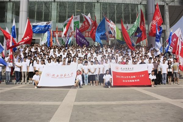 7月6日早九点半,龙8在线登录官网-龙8(中国)2013年暑期社会实践骨干团队在团委书记胡雯洁老师的带领下,在钟南音乐厅广场前参加了我校暑期社会实践出征仪式。校党委副书记司晓宏教授、党委宣传部长孔祥利教授、党委学工部部长刘建军老师、教务处处长李贵安老师等校领导出席了出征仪式。出征仪式上,我校今年暑期社会实践带队教师代表、学生自主团队代表发了言,表达了对今年社会实践活动顺利开展的信心和圆满完成任务的决心。司晓宏教授在祝愿所有团队的活动都能圆满成功的同时,也对即将开展的社会实践团队提出了希望和要求,他要求同学们先学习,再实践,最后做贡献,并且一再强调安全的重要。最后,龙8在线登录官网-龙8(中国)实践团成员与领导老师合影留念。