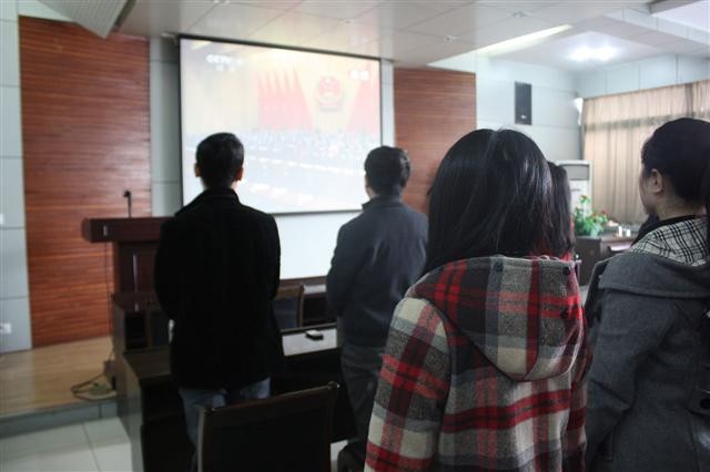 3月5日上午9点,龙8在线登录官网-龙8(中国)组织部分教工和学生,在学院报告厅收看了十二届全国人大一次会议开幕式及温家宝总理《政府工作报告》。学院党委书记胡波、副书记袁冰,副院长刘侍刚、许广玺,办公室主任王鑫、团委书记胡雯洁和部分教师、研究生、本科生等一同观看了开幕式。