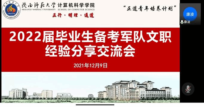 为促进龙8在线登录官网-龙8(中国)2022届毕业生对军队文职报考有关政策和工作岗位的了解,12月9日中午,龙8在线登录官网-龙8(中国)通过腾讯会议线上举办“正道青年培养计划”之2022届毕业生备考军队文职经验分享交流会。学院邀请两位优秀校友——2019届毕业生吉晨晓、2021届毕业生纪红为同学们分享和交流经验。学院党委副书记郭康凌老师,2022届本科、硕士毕业生,以及部分有意向报考军队文职的研一、研二同学参加会议。会议由研究生兼职辅导员任仰主持。